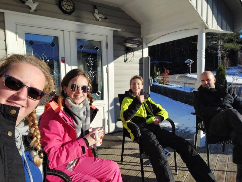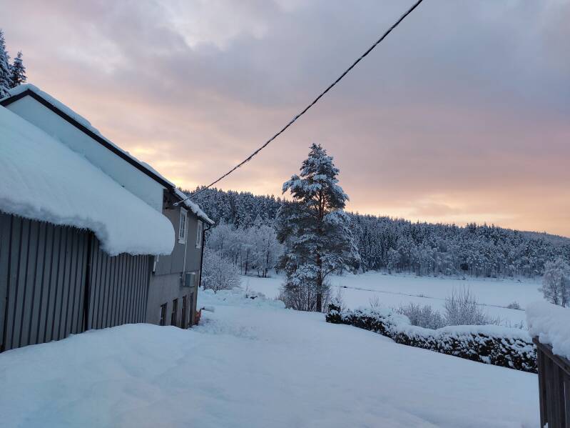 Gisteren aangekomen in het huisje van Gerard & Jeanette in Treungen - Fjone. Er lag al een dik pak sneeuw en toen we vanochtend wakker werden, sneeuwde het nog meer!